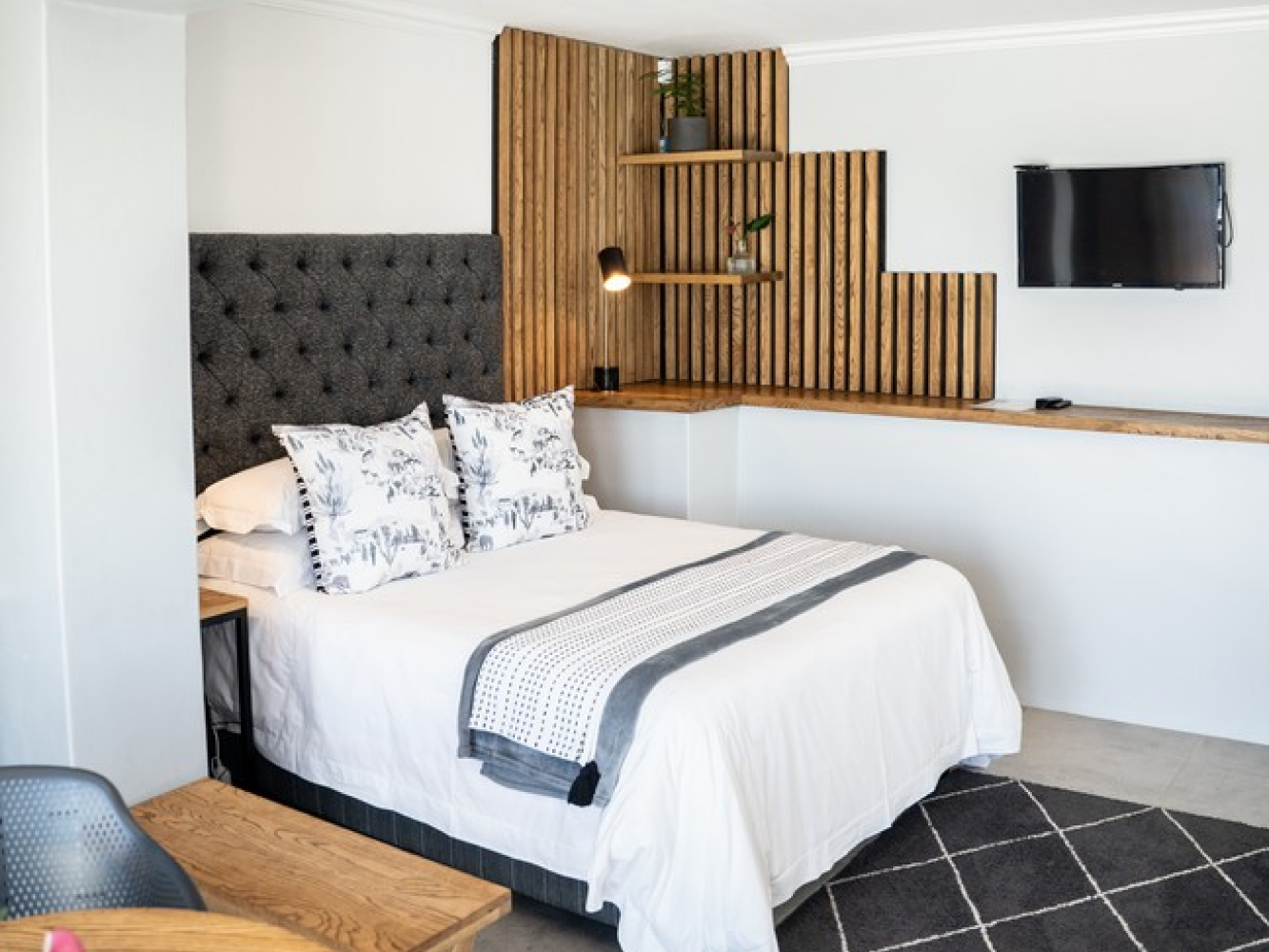 - Queen-sized bed with quality linens